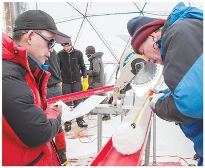 为确保冰芯不融化,钻取冰芯的工作通常是在夜间完成的,夏季晚上8时到第二天早上8时是最佳时机。“最佳”意味着温度低,科考队员们会用呼气来判断开工时间:能呼出“白气”,温度就低于零摄氏度了。夜间低温状态下工作,队员们需要身着3公斤的厚重工作服作业,每一个动作都像在抵抗凝固的冷空气,连最简单的器械操作、穿脱手套都迟缓而费力。