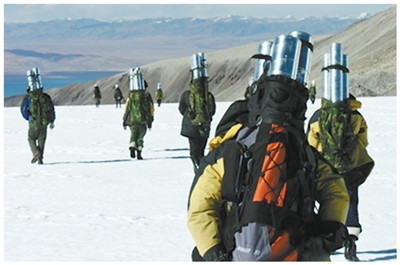 2006年,中美联合科考队队员携带纳木那尼冰芯返回科考大本营。